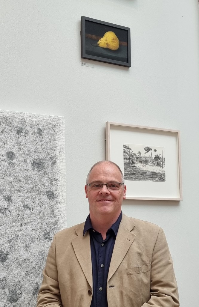 My painting ‘Steel’ no. 863 was selected by her and hangs in Room 5. ‘Steel’ portrays a pear, a fragment of nature, prone and vulnerable, laid bare to scrutiny in an unsettlingly, ambiguous environment. The title ‘Steel’ reflects nature’s problematic relationship to man, industry and their impact on the environment. It refers to evidence of 2 cut marks to the skin of the pear, to the pear’s stem, shaped as a sabre, resting as if in submission on the steel, blue-grey surface.