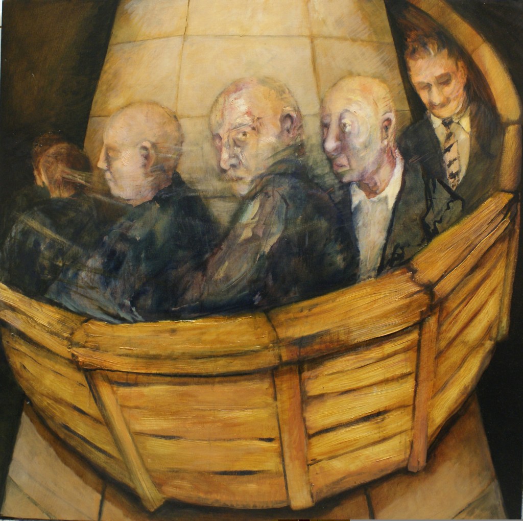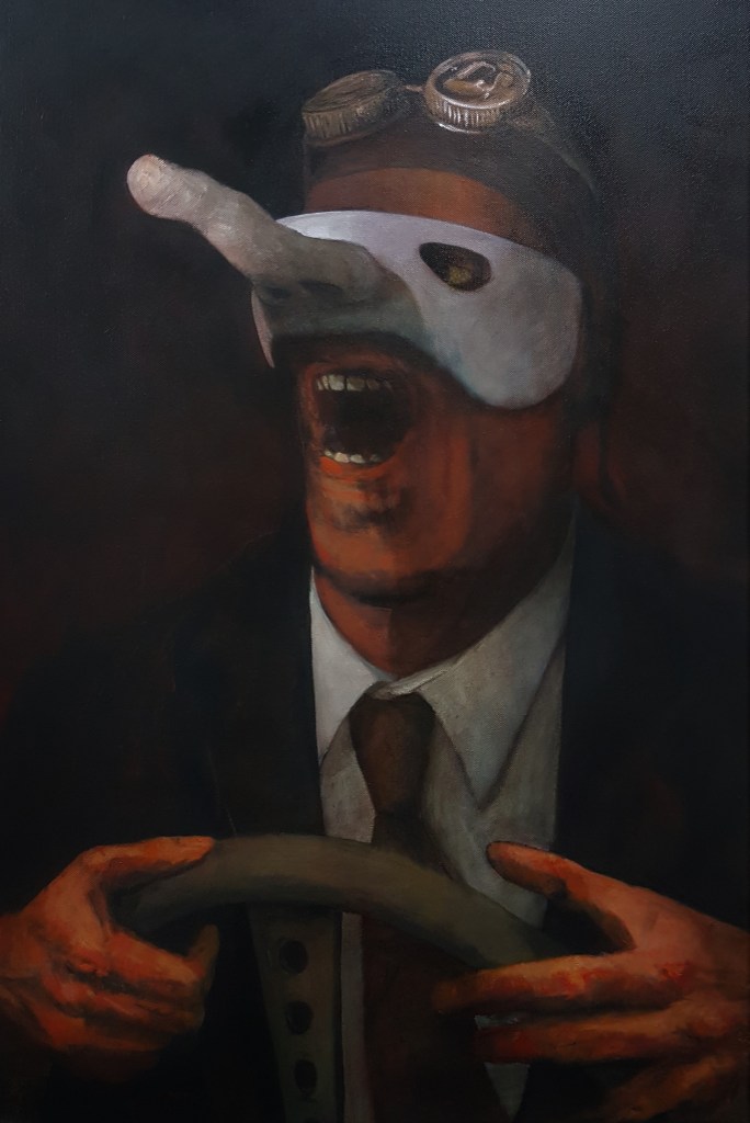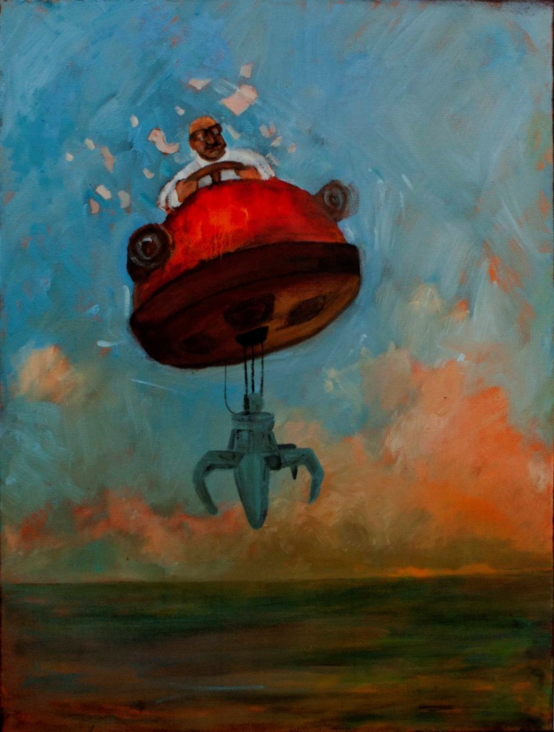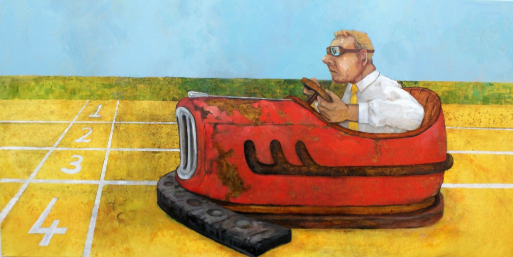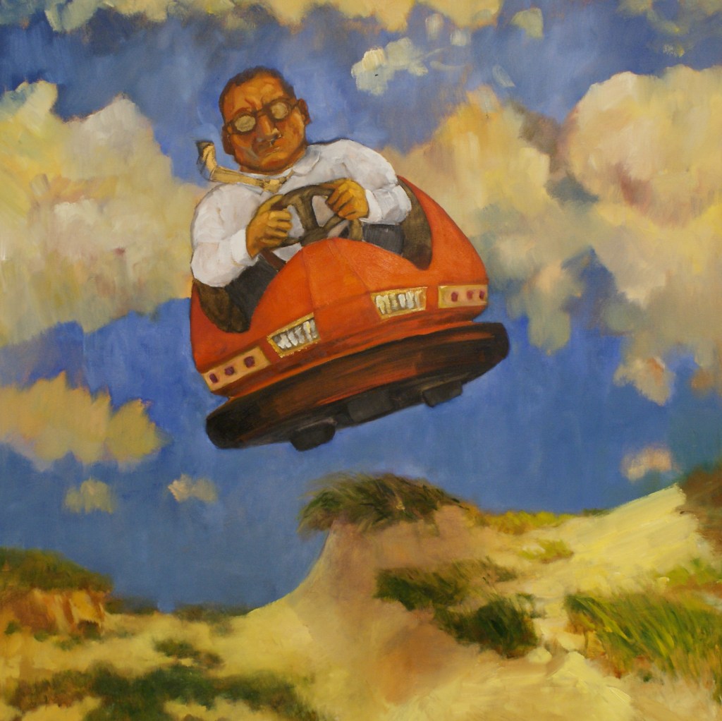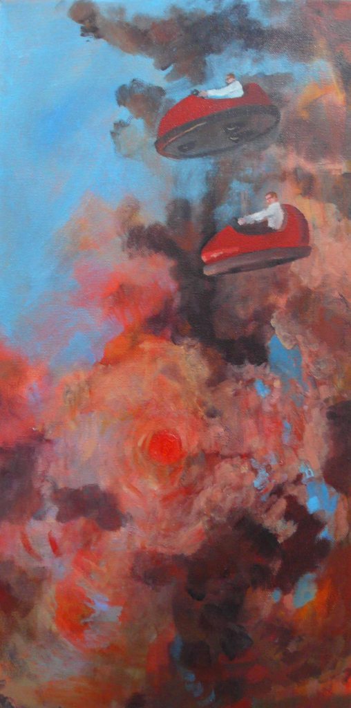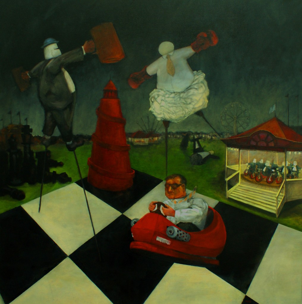 This series combines magical realism with social satire and commentary. Set by the coast, fun fairs, lighthouses, beached icons of consumerism, armies of men in suits; serve as characters and backdrops for a very contemporary farce. There is a sense of a garden of earthly delights gone wrong, a bonfire of the vanities; as lost, often surreal figures, grotesques, at once trapped in their own conceit and social manner strut across apocalyptic amusement parks. ‘Alpha’ males launch themselves in flying dodgem cars in vain attempts at transcendance. Kerrison was brought up in Glasgow and the influence of the dystopic writing in Alistair Gray’s ‘Lanark’ and the artists of Scottish painters of the 1980’s such as Peter Howson is clear. With titles like ‘Crunch Time’ an attempt at some critique of the current economic situation is clear. Within this ambivalent critique of capital, the ghosts of memory resonate through Kafkaesque landscapes of 20th century nightmares and male angst, refracted through a comic-book eye.