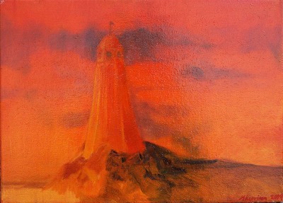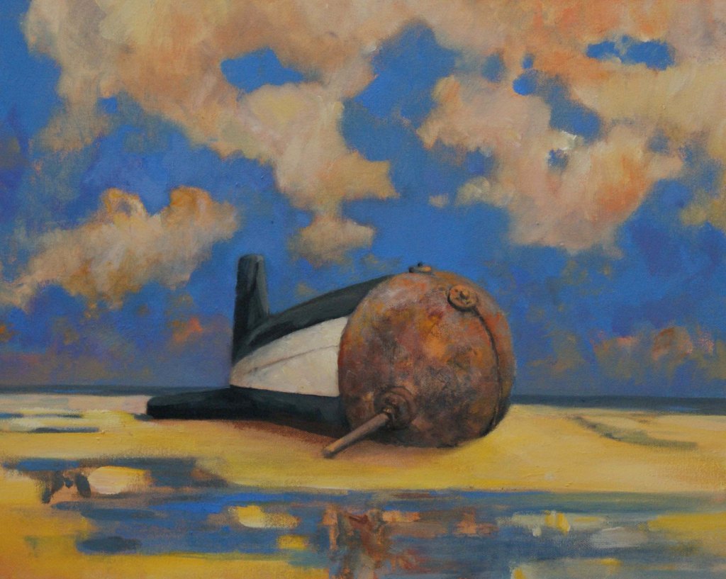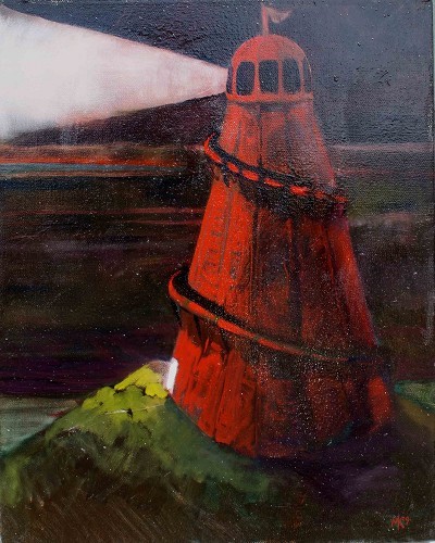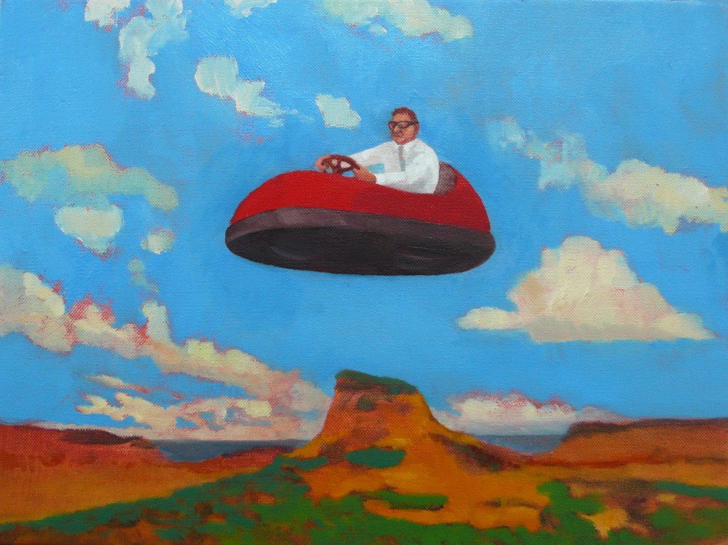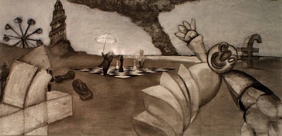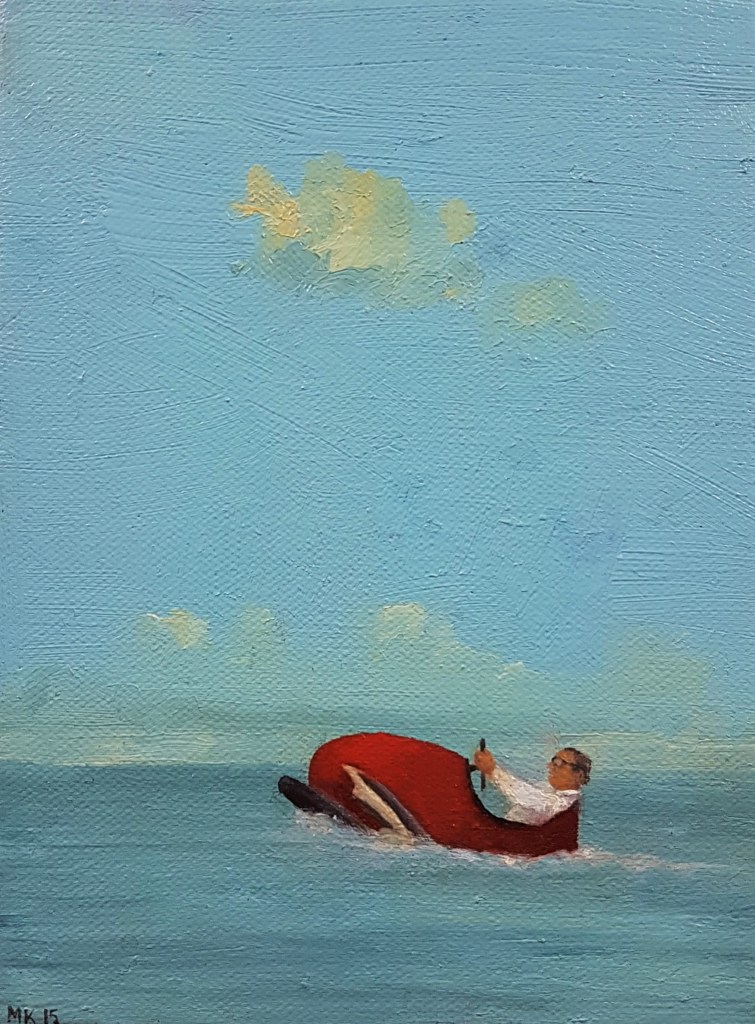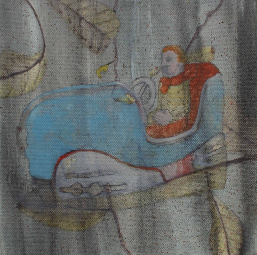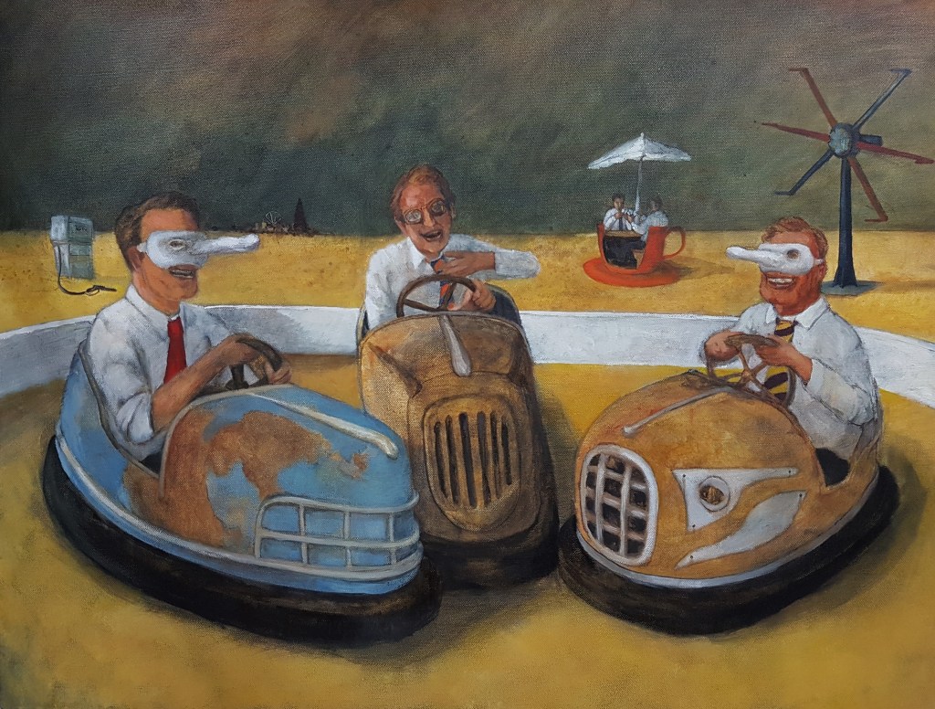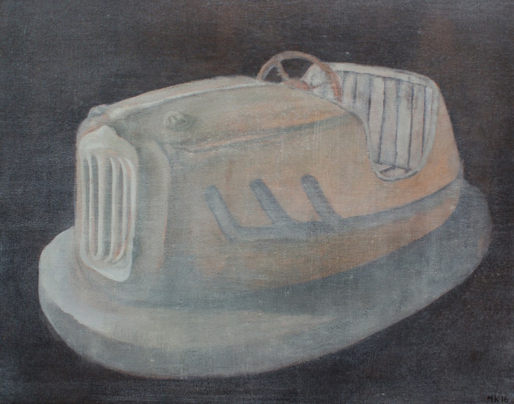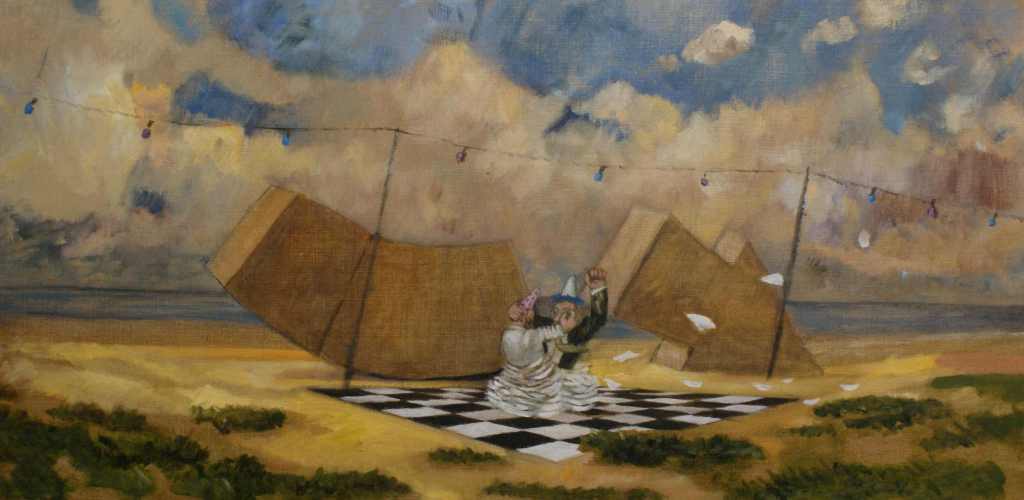 This series combines magical realism with social satire and commentary. Set by the coast, fun fairs, lighthouses, beached icons of consumerism, armies of men in suits; serve as characters and backdrops for a very contemporary farce. There is a sense of a garden of earthly delights gone wrong, a bonfire of the vanities; as lost, often surreal figures, grotesques, at once trapped in their own conceit and social manner strut across apocalyptic amusement parks. ‘Alpha’ males launch themselves in flying dodgem cars in vain attempts at transcendance. Kerrison was brought up in Glasgow and the influence of the dystopic writing in Alistair Gray’s ‘Lanark’ and the artists of Scottish painters of the 1980’s such as Peter Howson is clear. With titles like ‘Crunch Time’ an attempt at some critique of the current economic situation is clear. Within this ambivalent critique of capital, the ghosts of memory resonate through Kafkaesque landscapes of 20th century nightmares and male angst, refracted through a comic-book eye.